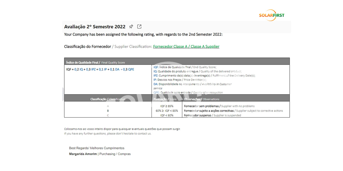 포르투갈에 있는 주요 유럽 고객사 중 한 곳과 10년간의 파트너십을 맺게 되어 자랑스럽게 생각합니다. 10년간의 협력 기간 동안 저희는 3단계(A, B, C) 분류 체계에서 가장 높은 등급인 A등급 공급업체 지위를 꾸준히 유지해 왔습니다.