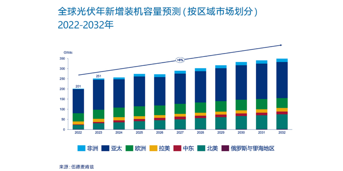 우드 맥켄지는 2022년부터 2032년까지 글로벌 PV 설비가 연평균 6% 성장할 것으로 전망하고 있으며, 2028년까지 북미가 유럽의 연간 점유율을 넘어설 것으로 예상합니다.