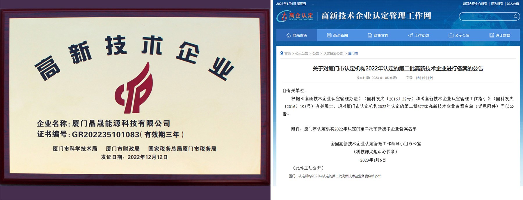 이 성과는 샤먼 솔라 퍼스트 에너지 테크놀로지 주식회사가 2022년 12월 12일 국가세무총국 샤먼 세무국, 샤먼 과학기술국, 샤먼 재정국으로부터 국가 하이테크 기업 명예 증서를 수여받은 데 따른 것입니다. 이 인증은 솔라 퍼스트 에너지가 최근 몇 년간 이룬 과학기술 혁신 성과에 대한 권위 있는 국가적 인정을 의미합니다.