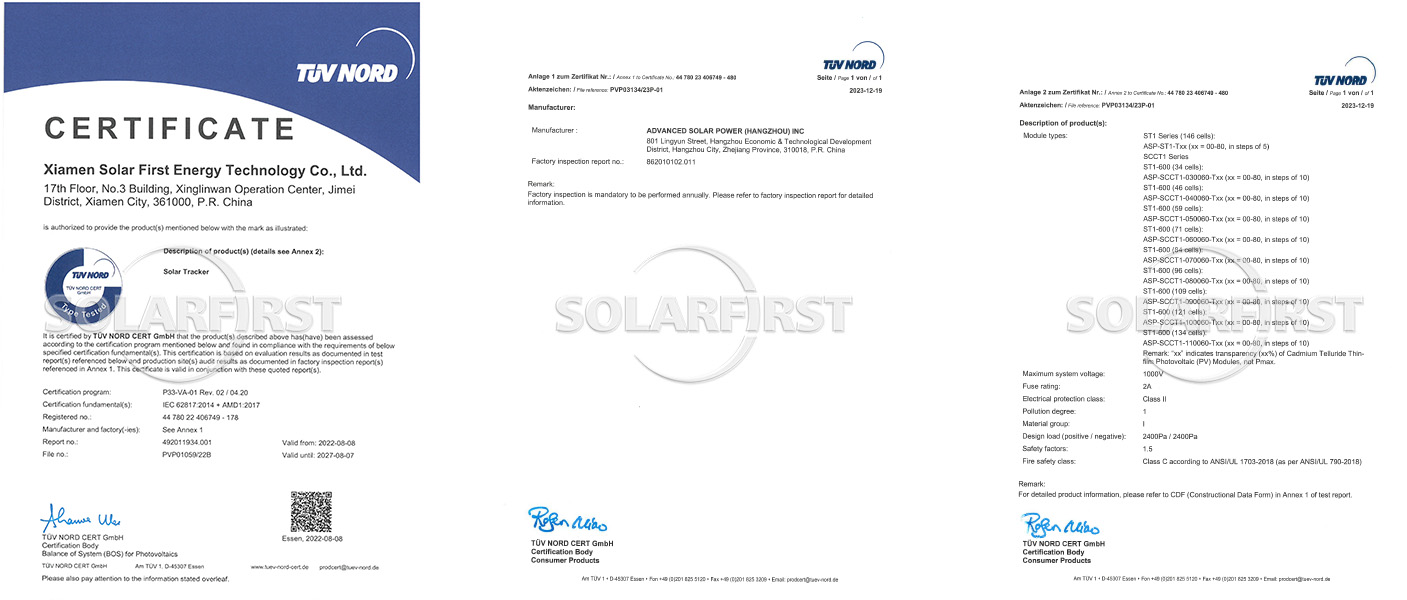 2022년 8월 초, Solar First Group이 독자적으로 개발한 Horizon S-1V 및 Horizon D-2V 추적 시스템이 TÜV North Germany의 인증 시험을 성공적으로 완료하여 IEC 62817 인증을 획득했습니다. 이번 인증을 통해 Solar First의 추적 제품은 국제 시장 진출을 확대하는 동시에 권위 있는 국제 인증을 통해 안정성과 신뢰성을 입증받게 되었습니다.