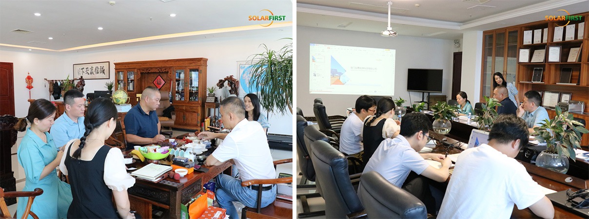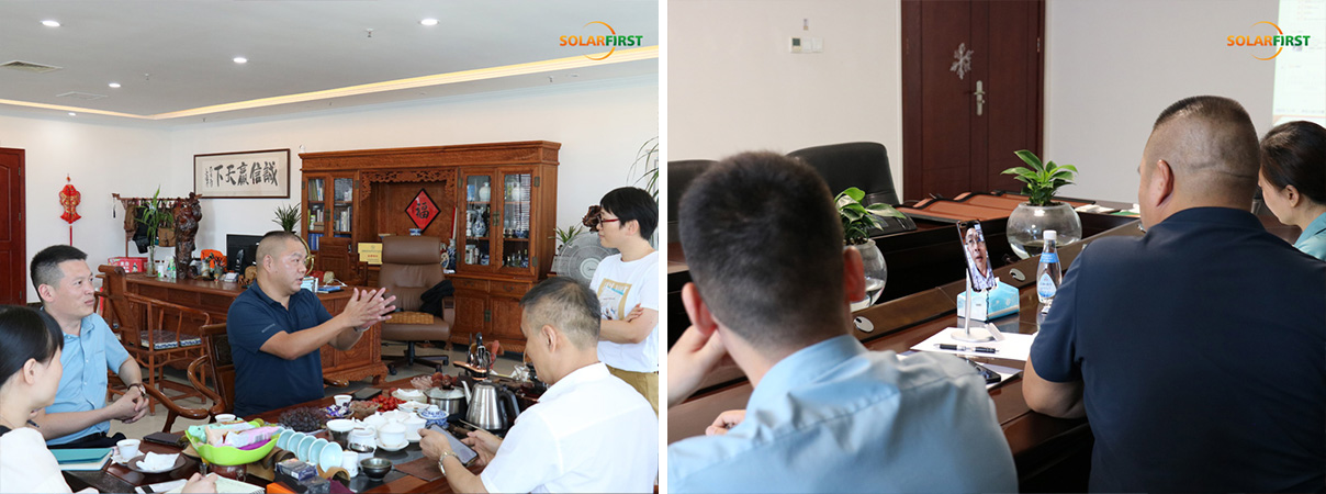 2022년 7월 21일, 신의유리(둥관) 유한공사(이하 "신의유리") 임원진이 솔라퍼스트그룹(Solar First Group)을 방문했습니다. 랴오장훙(Liao Jianghong) 부사장, 리지쉬안(Li Zixuan) 부사장, 저우정화(Zhou Zhenghua) 영업부장으로 구성된 대표단은 솔라퍼스트그룹 예송핑(Ye Songping) 사장 및 저우핑(Zhou Ping) 상무이사의 초청으로 건물일체형 태양광(BIPV) 제품 연구개발 협력 방안을 논의했습니다.