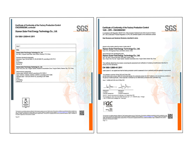 이 인증은 다음에 적용됩니다. 철구조물 및 알루미늄구조물 ~에 따라 마케팅됨 샤먼 솔라 퍼스트 에너지 테크놀로지 유한회사 브랜드이며 회사 생산 시설에서 제조됩니다.