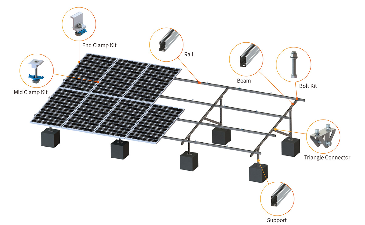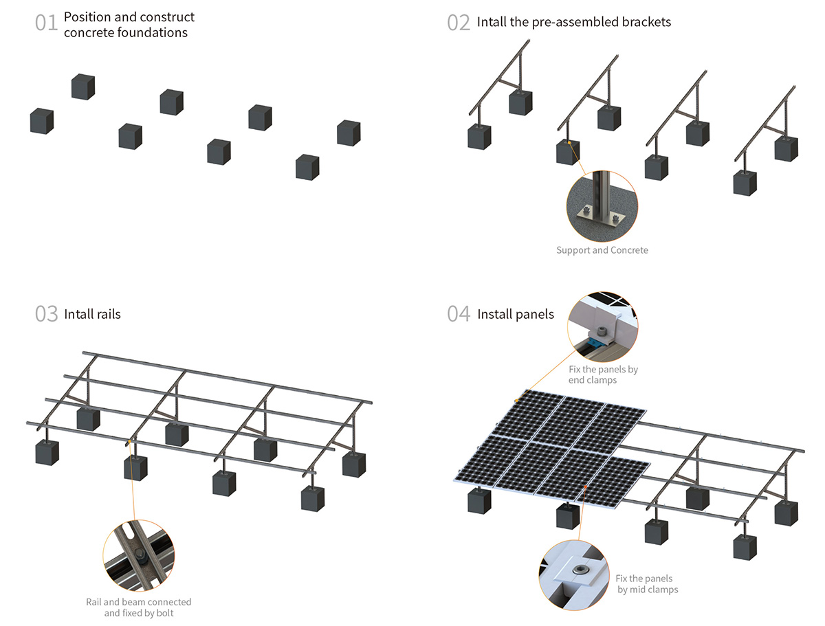 키 빔과 지지대는 공장에서 사전 조립되어 현장 인력을 최소화하고 설치 시간을 단축합니다. 독특하게 설계된 베이스 플레이트는 높이 조절과 전후 위치 조정이 가능하여 다양한 지형과 모듈 레이아웃 요구 사항에 유연하게 대응할 수 있습니다.