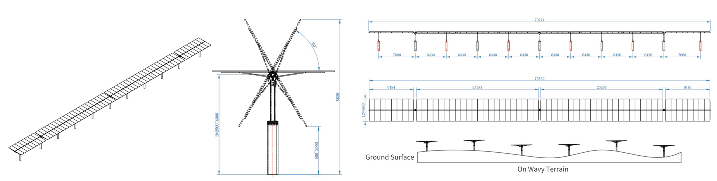 ✔ 경사면 및 기복이 있는 지형: 적용 시스템: 경사형 단일 축/적응형 이중 축 시스템
