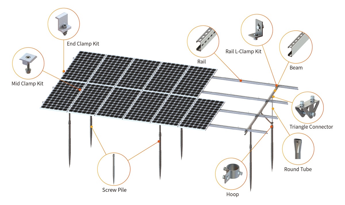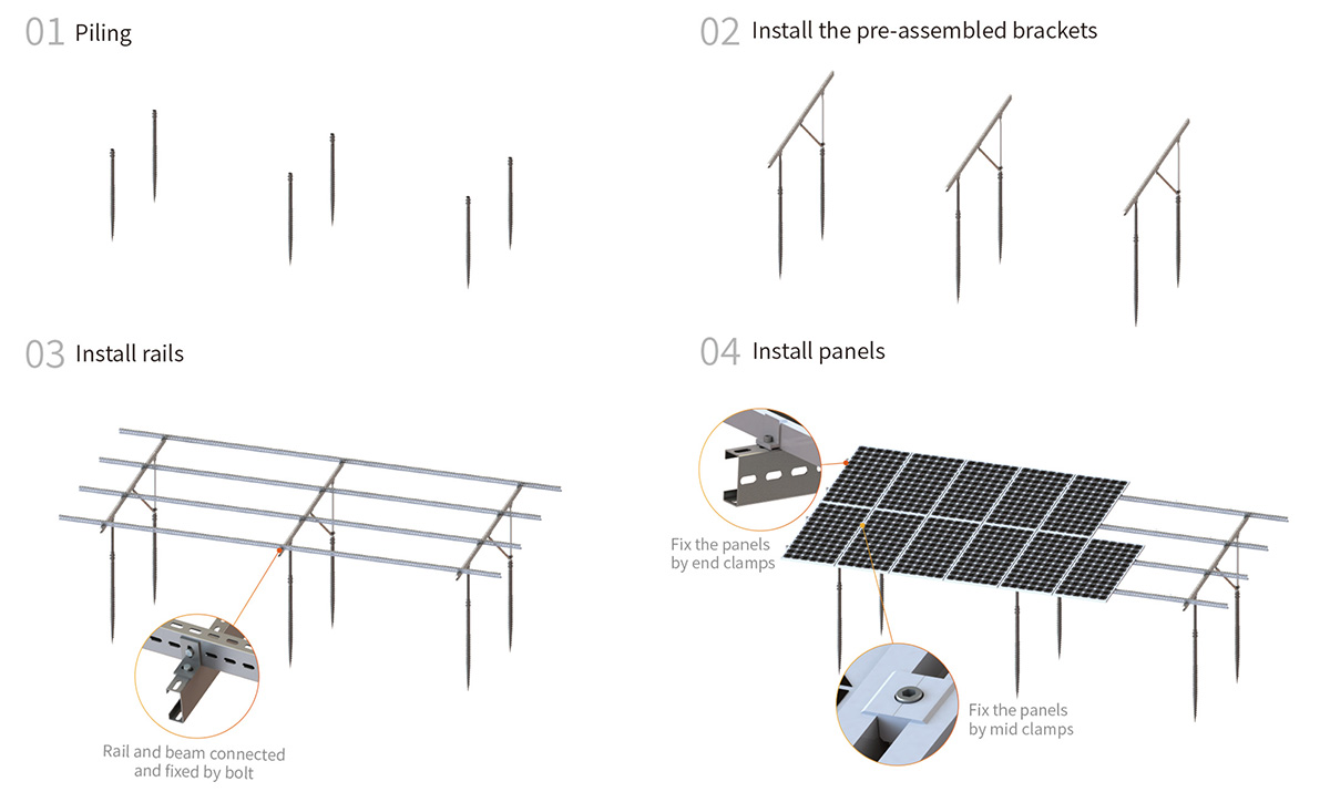 다재다능함과 비용 효율성을 염두에 두고 설계된 이 시스템은 C형 및 U형 단면과 같은 최적화된 강철 프로파일을 사용하여 자재비와 인건비를 절감하고 설치를 간소화합니다. 메가와트급 태양광 발전소든 상업용 프로젝트든, 이 솔루션은 지상 설치형 태양광 패널에 효율적이고 내구성 있는 옵션을 제공합니다.